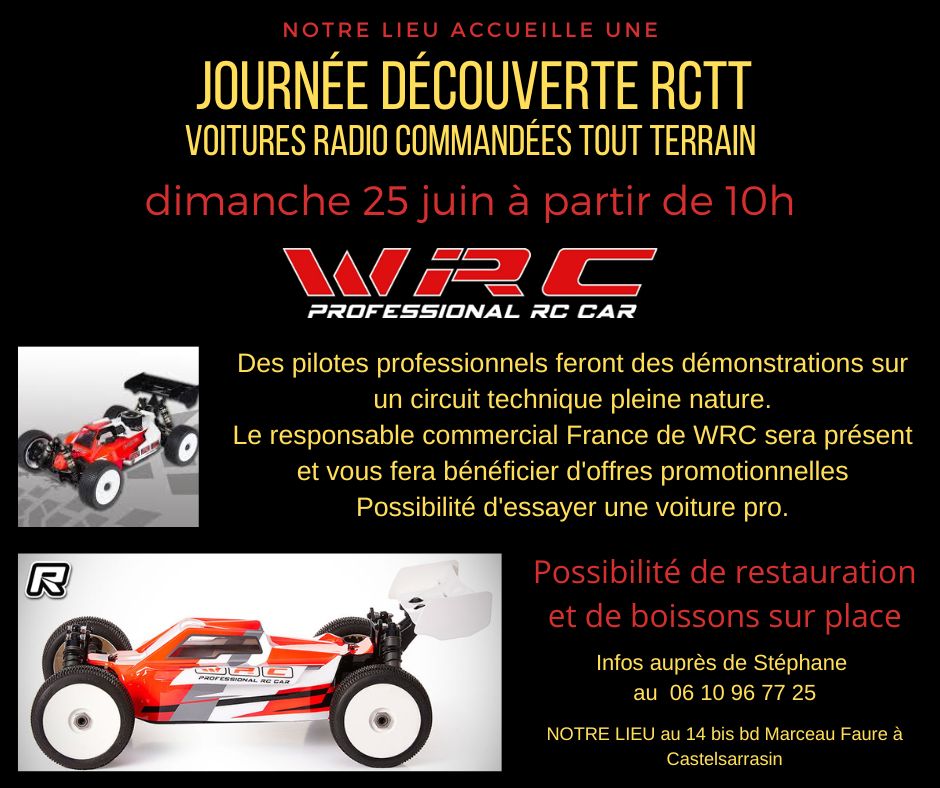 Des pilotes professionnels feront des démonstrations sur un circuit technique pleine nature. Le responsable commercial France de WRC sera présent et vous fera bénéficier d'offres promotionnelles Possibilité d'essayer une voiture pro. Infos auprès de Stéphane au 06 10 96 77 25 Possibilité de restauration et de boissons sur place