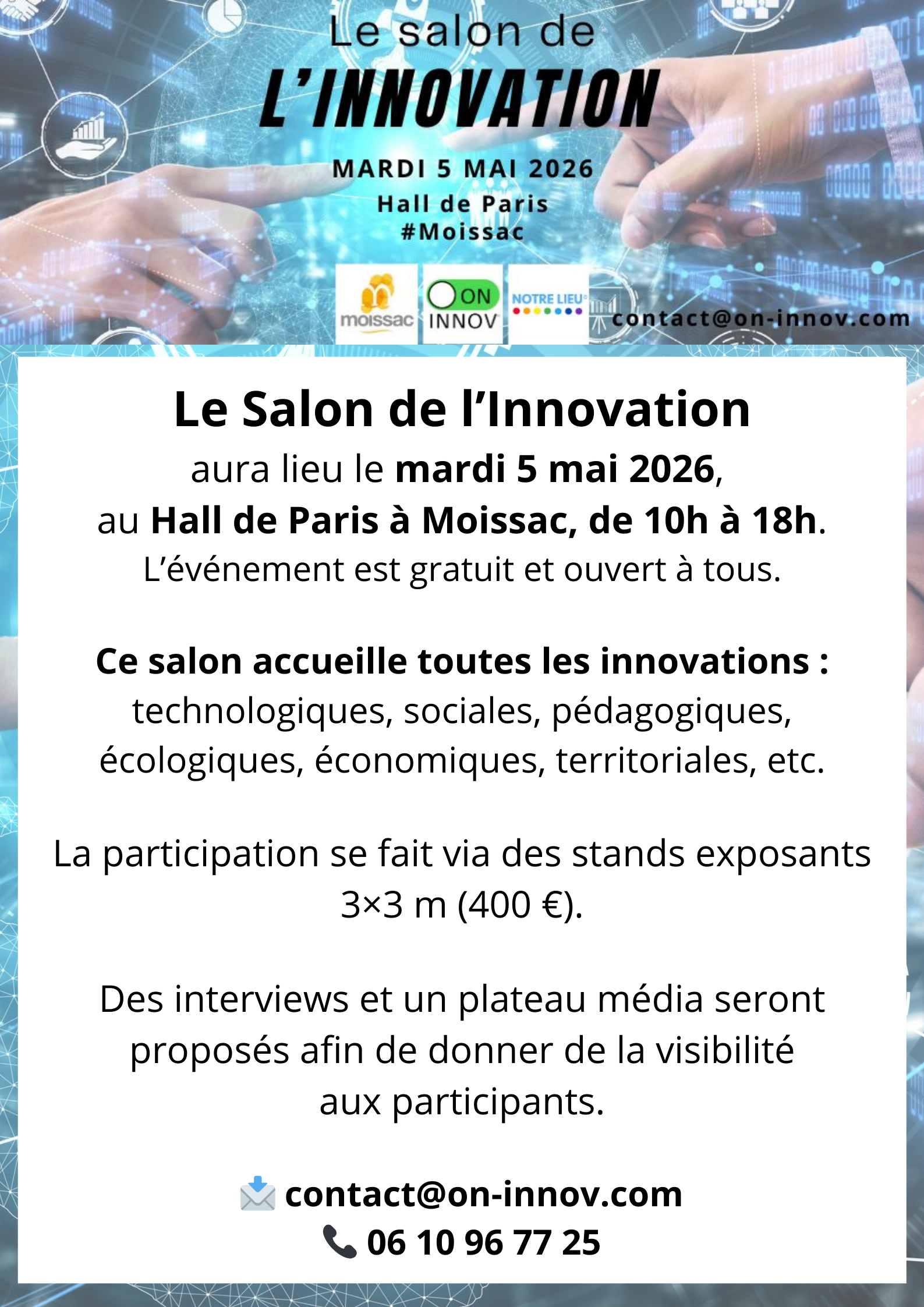 Plus de renseignements : contact@on-innov.com / 06 10 96 77 25